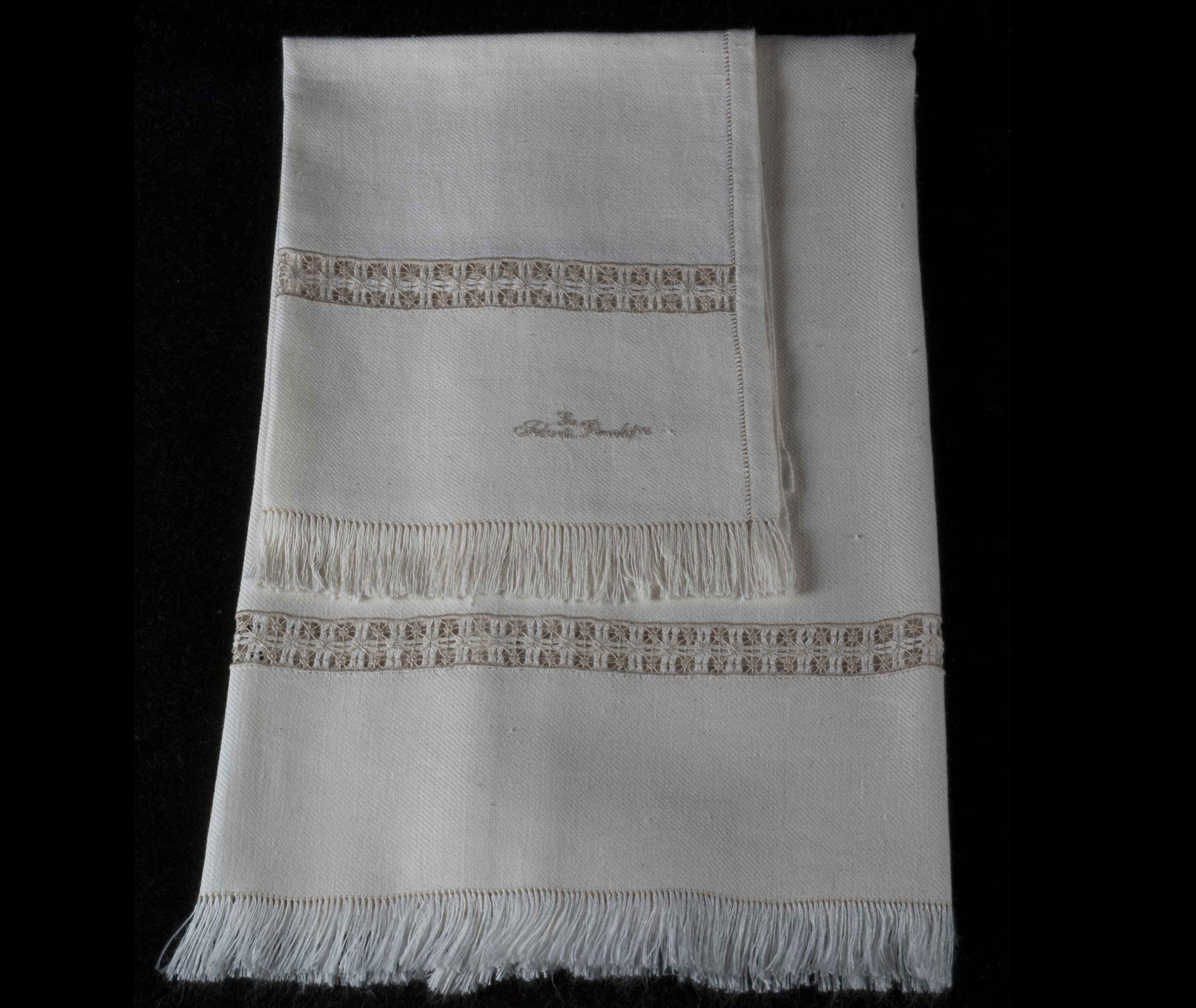 Particolarità di questo set è lo sfilato siciliano centrale "Rete Margherita" e le sottili frange fermate con punto ajour.