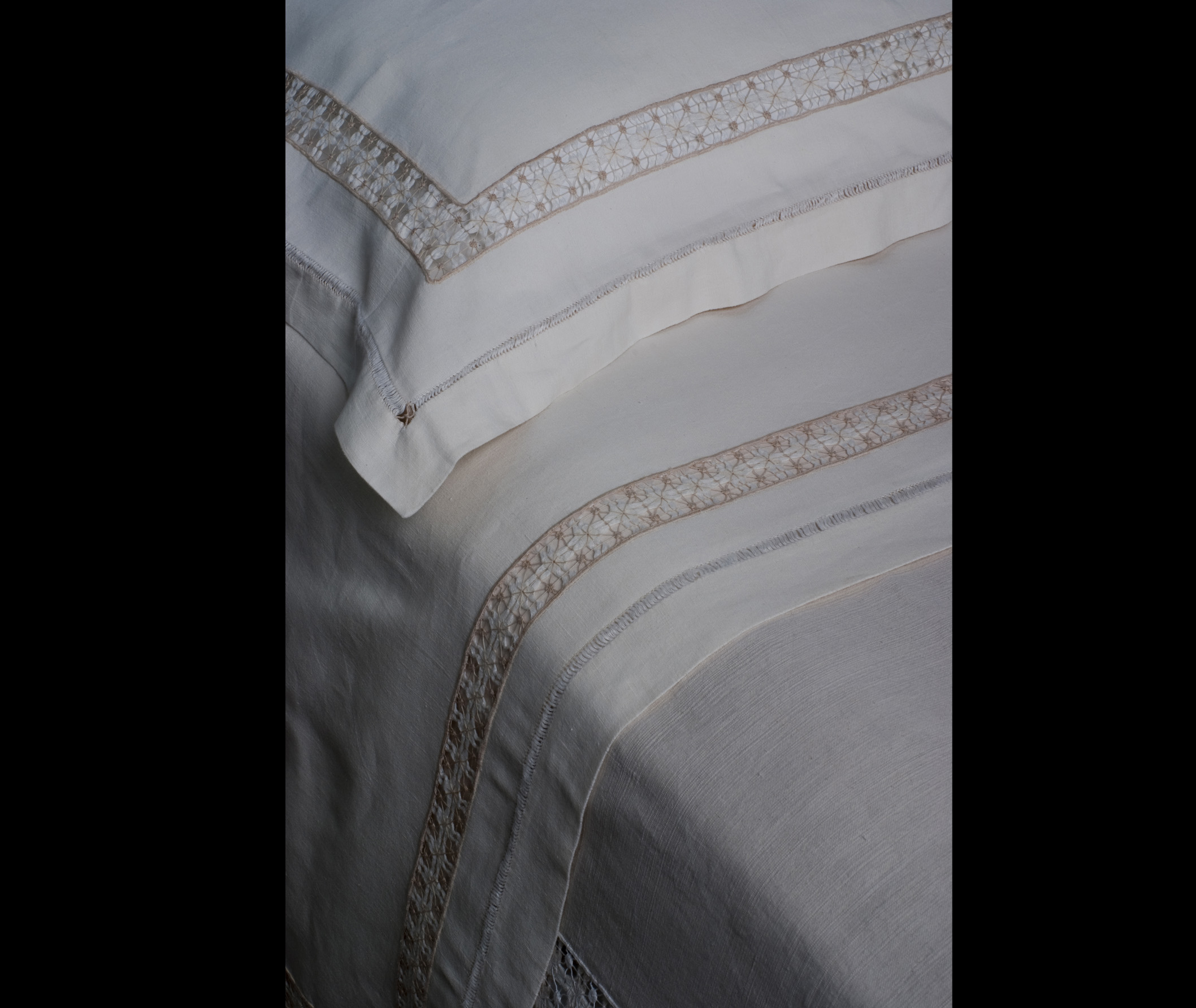 Sublime lo sfilato siciliano "Rete Margherita", di colore ecrù, che arricchisce questo lenzuolo sulla balza e sulle federe, su un supporto in tela di lino avorio. Questo elegante capo è composto da tre teli, uniti da giunture invisibili eseguite a mano, ed è rifinito da un orlo ajour.
