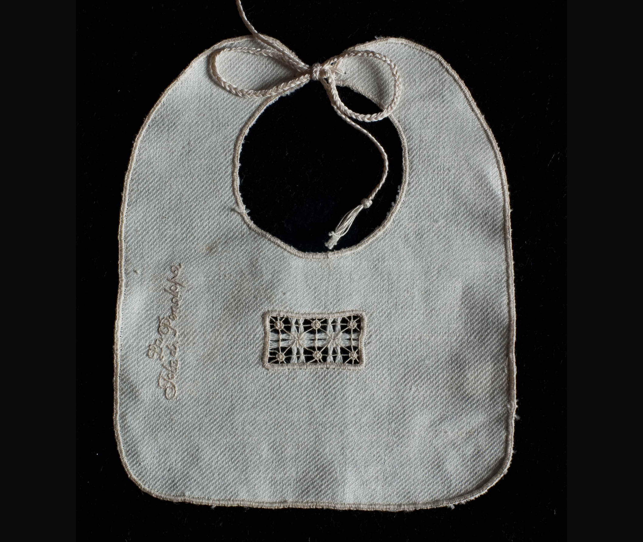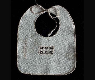 Bavetta quadrata realizzata in "pedi i lana", rifinita con cordoncino intrecciato e impreziosita da un piccolo ricamo nella parte centrale.
