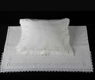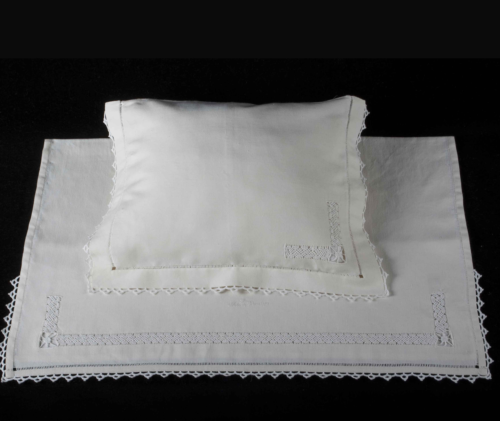 Lenzuolino in tela di lino, impreziosito da un raffinato ricamo "Rete San Marco", con orlo ajour. La federa e l'angolo sono rifiniti con un sottile pizzo uncinetto.