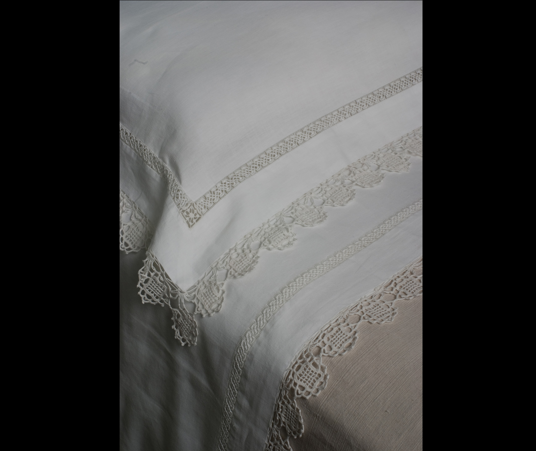 Semplice ed elegante lo sfilato siciliano "Rete San Marco", di colore bianco, che arricchisce questo lenzuolo sulla balza e sulle federe, su un supporto in tela di lino. Il modello Calipso è composto da tre teli, uniti da giunture invisibili eseguite a mano, ed è impreziosito da un' orlo con pizzo uncinetto a roselline antiche.
