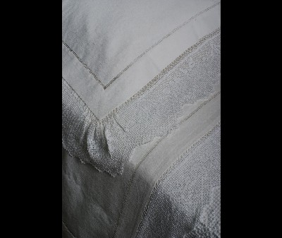 Un prezioso ed elegante pizzo, di colore bianco, arricchisce questo lenzuolo sulla balza e sulle federe, su un supporto in tela di lino. Questo capo è composto da tre teli, uniti da giunture invisibili eseguite a mano, ed è impreziosito da un orlo ajour.