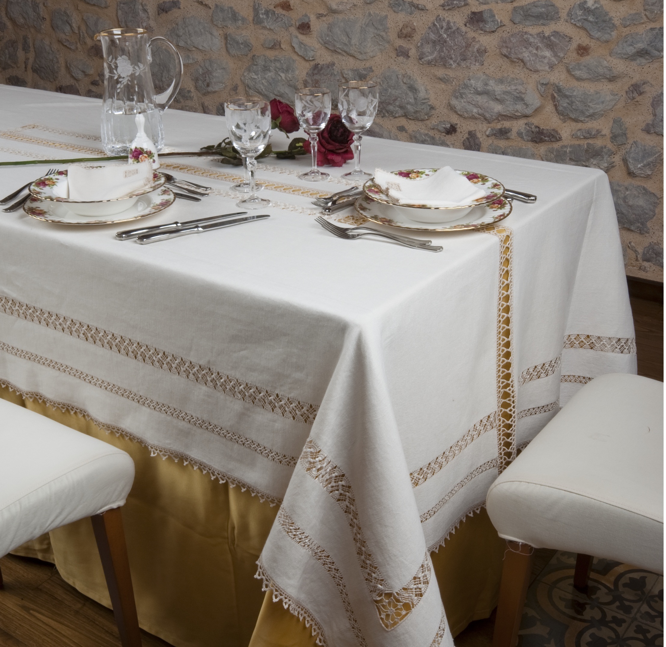 Eleganti e raffinati i preziosissimi ricami che caratterizzano questa tovaglia composta da due teli uniti da una giuntura in pizzo. Arricchita sui bordi e al centro da sfilato siciliano "Rete San Marco". Il modello Afrodite è realizzato in tela di lino ed è rifinito con un sottile pizzo uncinetto.