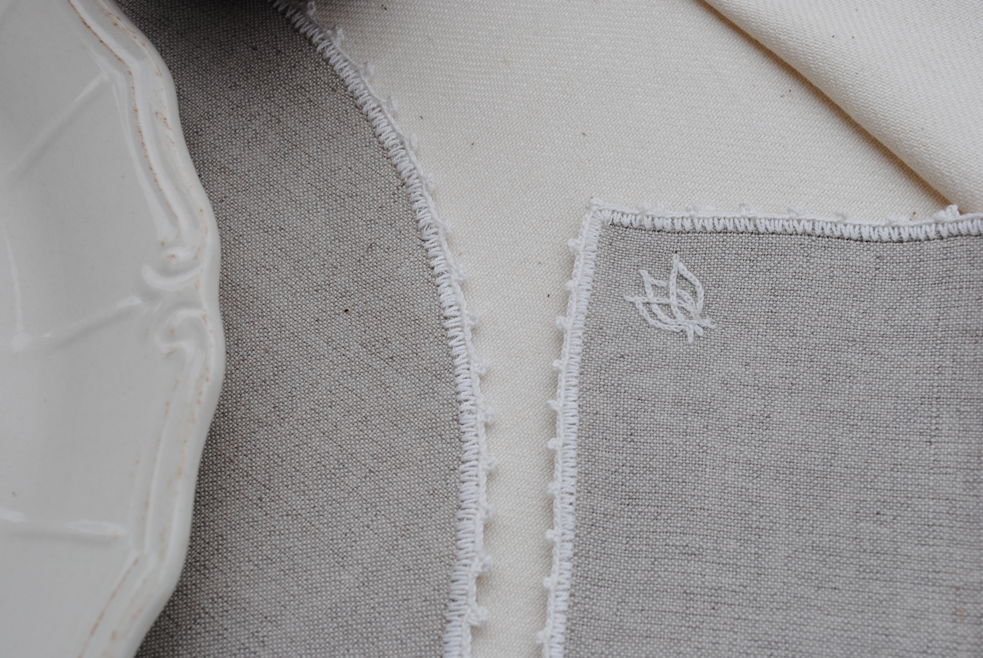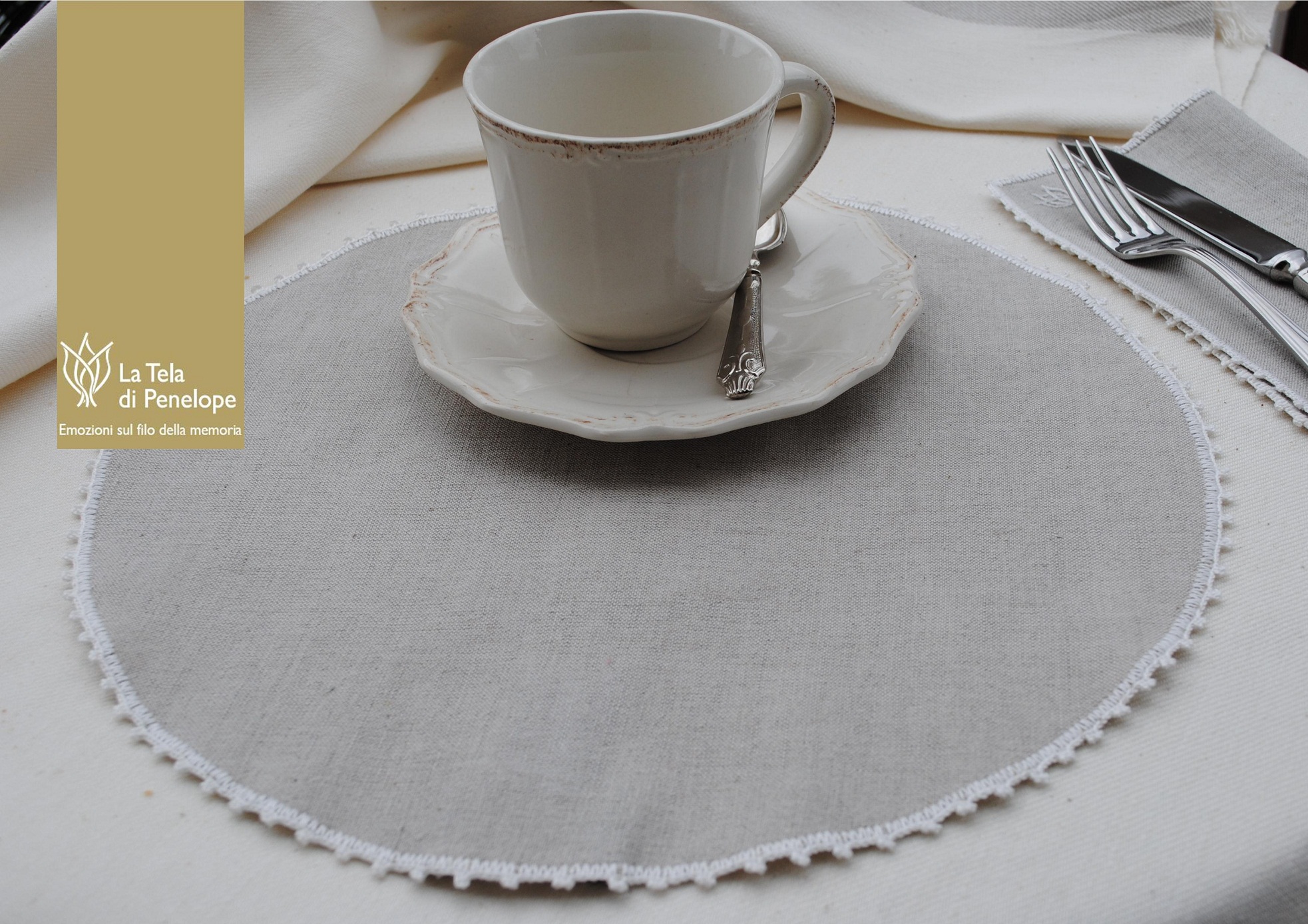 Disponibile come sottopiatto, sottopane, sottobottiglia e sottobicchiere, in bianco, avorio, ecrù e grigio.