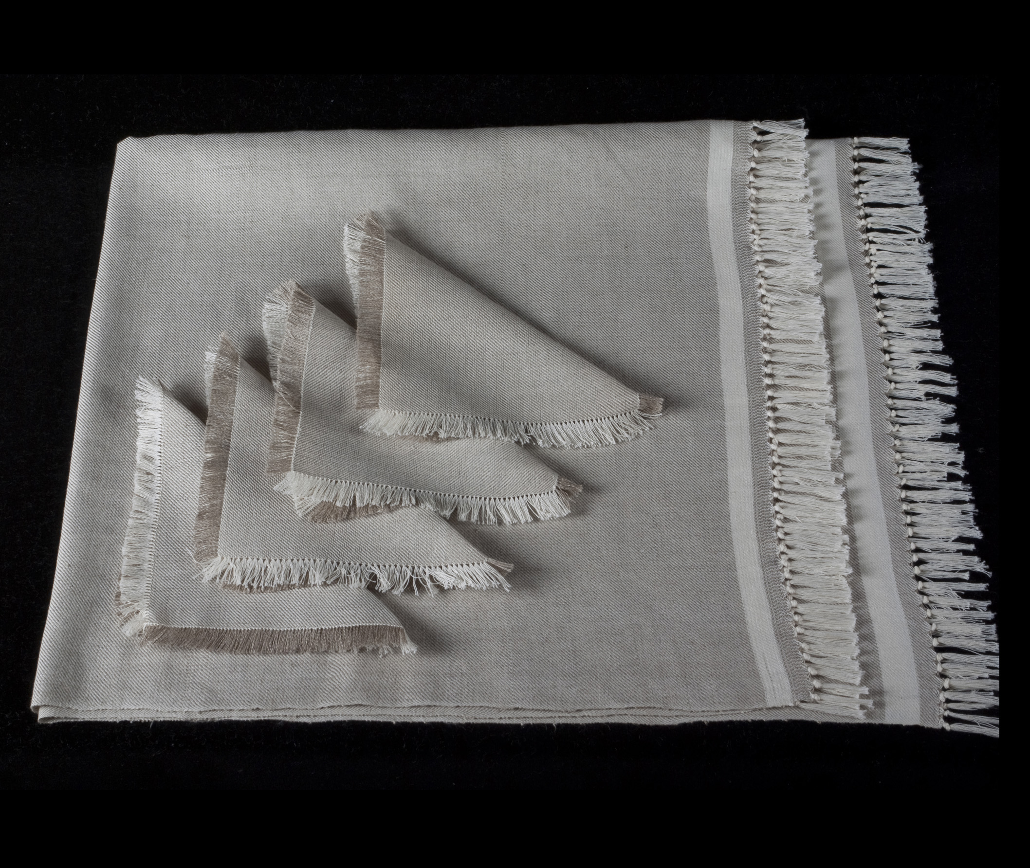 La semplicità del lino e l'unicità della lavorazione di questo tessuto rendono questo modello raffinato e adatto ad ogni occasione. Impreziosito, sui due lati, da una banda di colore avorio e da frange annodate a mano.