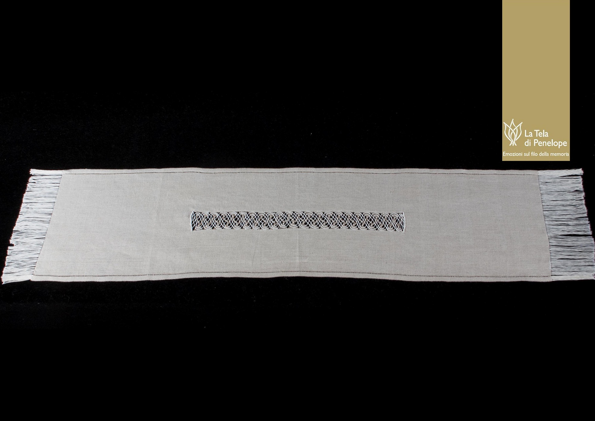 Lo sfilato siciliano "Rete San Marco", nella parte centrale, e le sottili frange, su due lati, caratterizzano questa striscia, rifinita con orlo ajour.